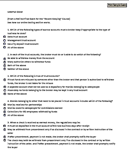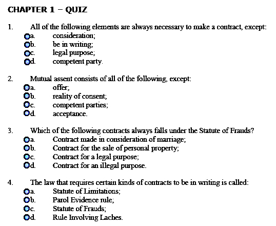 You do NOT submit or email, or otherwise "turn in" any of these exercises to the School. They are meant as exercises to help you learn the important concepts to pass the final and license exams, whether you complete them on your computer or in the books. And to help you absorb the important concepts - we give you the answers at the end of each chapter. (See below.) - Each chapter has an extensive Quiz, which continues to focus on important topics from the text and gives you actual examples of the tricky license exam questions. When answering the questions on your computer, you will notice the round "radio" buttons to click, indicating your choice for the correct answer to each question. These clickable "buttons" are merely for your convenience, to track the answers: As with the short-answer questions, your answers are not to be submitted to the school.