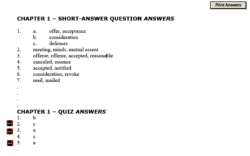 Note again that some of the Quiz questions in this example have the orange and black "Q&A" symbol. Click this icon on any of the hundreds of examples next to Short-Answer, Quiz, and Final and Prep Exam Questions and it will take you directly to another "plain English" explanation of the topic in our online Q&A resource. -